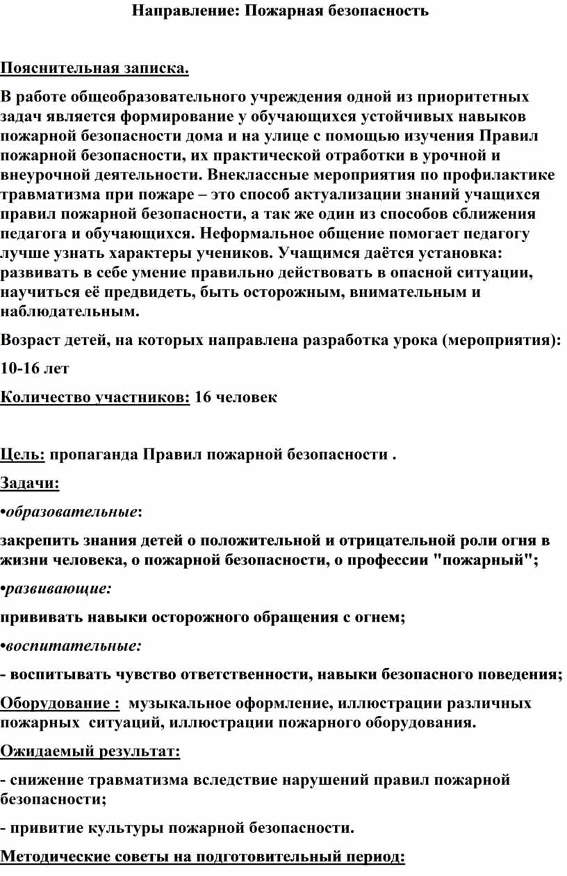 В работе общеобразовательного учреждения одной из приоритетных задач является формирование у обучающихся устойчивых навыков пожарной безопасности дома и на улице с помощью изучения Правил пожарной безопасности, их практической отработки в урочной и внеурочной деятельности. Внеклассные мероприятия по профилактике травматизма при пожаре – это способ актуализации знаний учащихся правил пожарной безопасности, а так же один из способов сближения педагога и обучающихся. Неформальное общение помогает педагогу лучше узнать характеры учеников. Учащимся даётся установка: развивать в себе умение правильно действовать в опасной ситуации, научиться её предвидеть, быть осторожным, внимательным и наблюдательным.