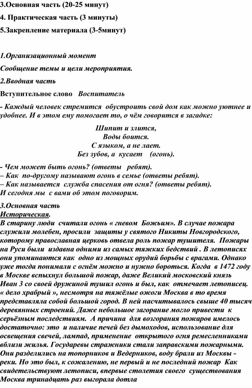 3.Основная часть Историческая. В старину люди считали огонь « гневом Божьим». В случае пожара служили молебен, просили защиты у святого Никиты Новгородского, которому православная церковь отвела роль пожар тушителя. Пожары на Руси были издавна одними из самых тяжких бедствий . В летописях они упоминаются как одно из мощных орудий борьбы с врагами. Однако уже тогда понимали с огнём можно и нужно бороться. Когда в 1472 году в Москве вспыхнул большой пожар, даже Великий московский князь Иван 3 со своей дружиной тушил огонь и был, как отмечает летописец. « дело храбрый », несмотря на тяжёлые ожоги Москва в то время представляла собой большой город. В ней насчитывалось свыше 40 тысяч деревянных строений. Даже небольшое загорание могло привести к серьёзным последствиям. А причина для возгорания пожаров имелось достаточно: это и наличие печей без дымоходов, использование для освещения свечей, лампад, применение открытого огня ремесленниками вблизи жилья. Государевы стражники стали заправскими пожарными. Они разделились на топорников и Ведерников, воду брали из Москвы - реки. Но это был, к сожалению, не первый и не последний пожар Как свидетельствуют летописи, впервые столетия своего существования Москва тринадцать раз выгорала дотла