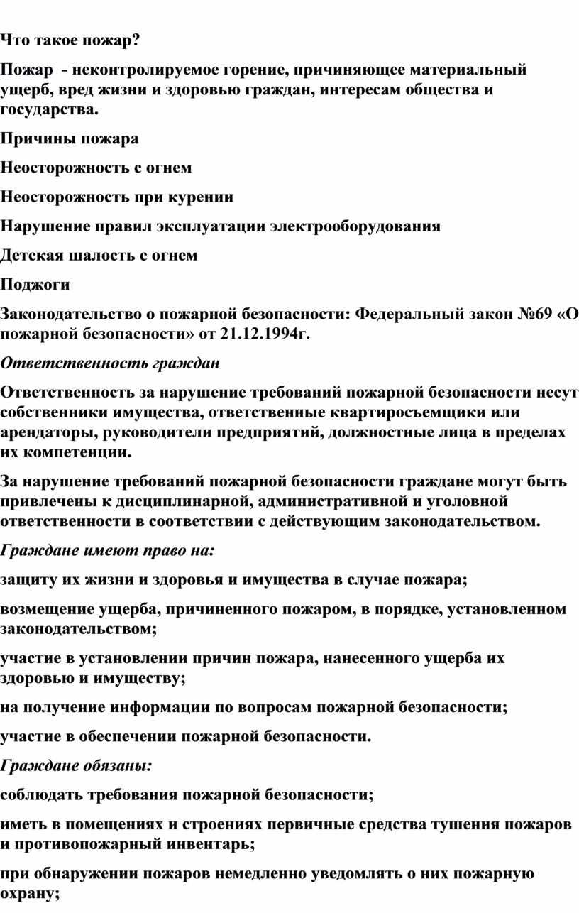 Законодательство о пожарной безопасности: Федеральный закон №69 «О пожарной безопасности» от 21.12.1994г.