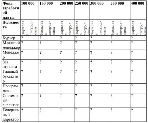 Далее, используя таблицу расчета штатного расписания (см. задание выше), определить величину заработной платы сотрудников фирмы для ряда заданных значений фонда заработной платы