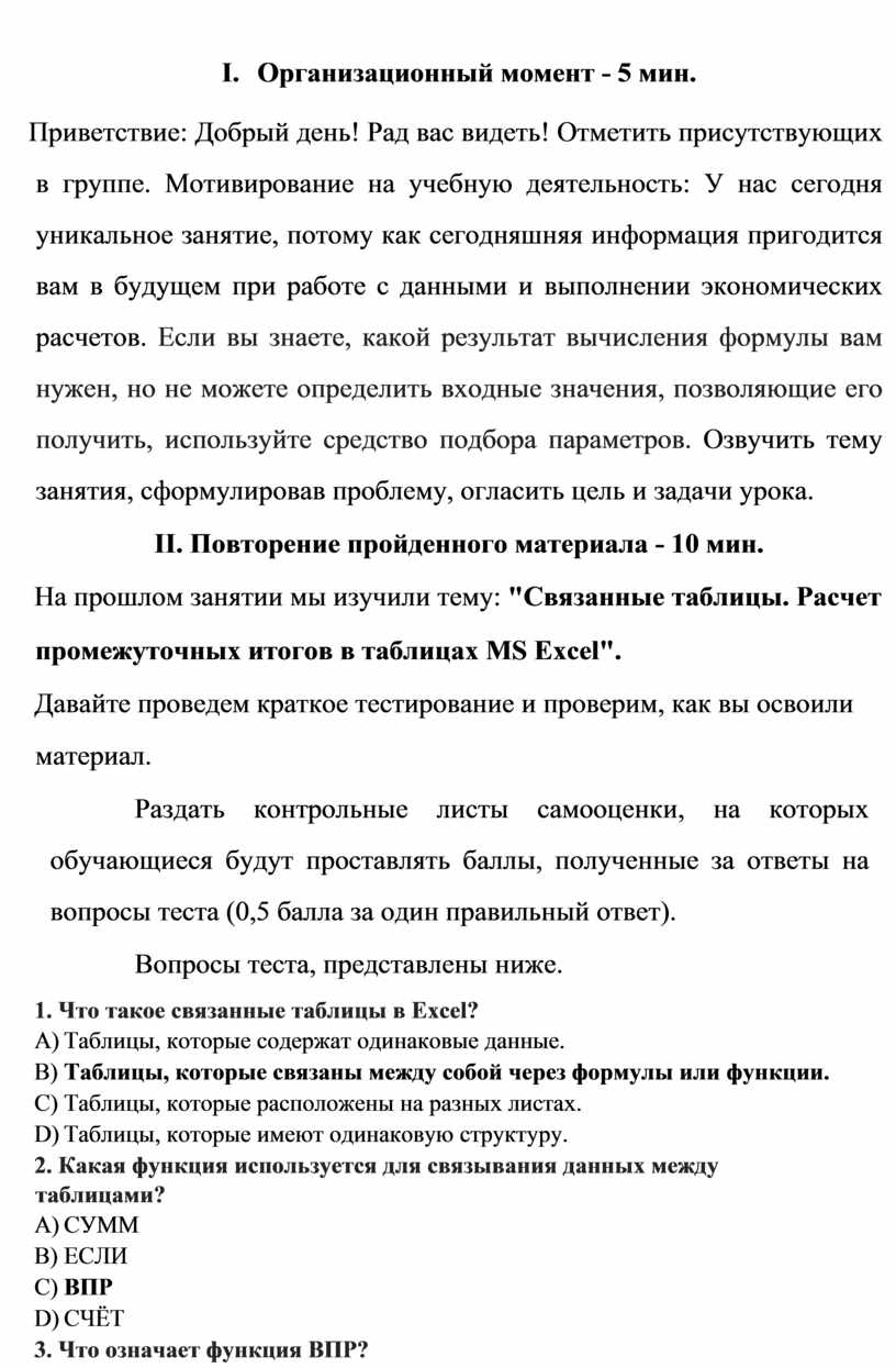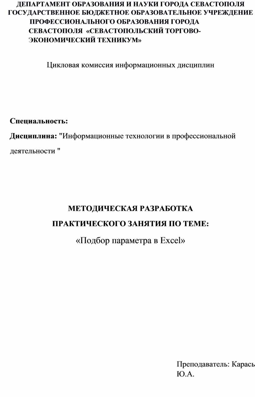 Приветствие: Добрый день! Рад вас видеть! Отметить присутствующих в группе. Мотивирование на учебную деятельность: У нас сегодня уникальное занятие, потому как сегодняшняя информация пригодится вам в будущем при работе с данными и выполнении экономических расчетов. Если вы знаете, какой результат вычисления формулы вам нужен, но не можете определить входные значения, позволяющие его получить, используйте средство подбора параметров. Озвучить тему занятия, сформулировав проблему, огласить цель и задачи урока.
