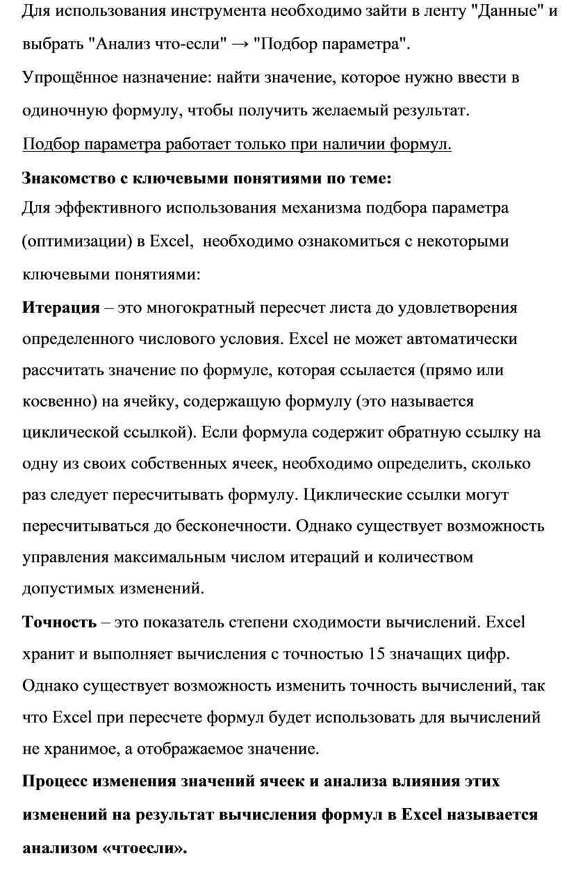Подбор параметра – определяет значение одной входной ячейки, которое требуется для получения желаемого результата в зависимой ячейке (ячейке результата).