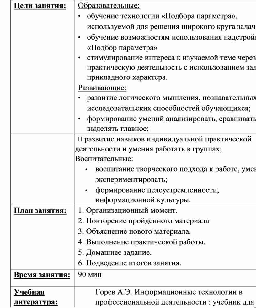 Образовательные: • обучение технологии «Подбора параметра», используемой для решения широкого круга задач. • обучение возможностям использования надстройки «Подбор параметра» • стимулирование интереса к изучаемой теме через практическую деятельность с использованием задач прикладного характера. Развивающие: • развитие логического мышления, познавательных и исследовательских способностей обучающихся; • формирование умений анализировать, сравнивать, выделять главное; |