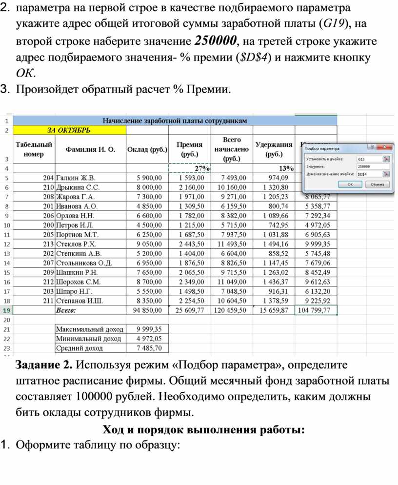 Краткая справка. К исходным данным этой таблицы относятся значения оклада и %Премии, одинакового для всех сотрудников. Результатом вычислений являются ячейки, содержащие формулы, при этом изменение исходных данных приводит к изменению результатов расчетов. Использование операции «Подбор параметра» в Microsoft Excel позволяет производить обратный расчет, когда задается конкретное значение рассчитанного параметра и по этому значению подбирается некоторое удовлетворяющее заданным условиям значение исходного параметра расчета.