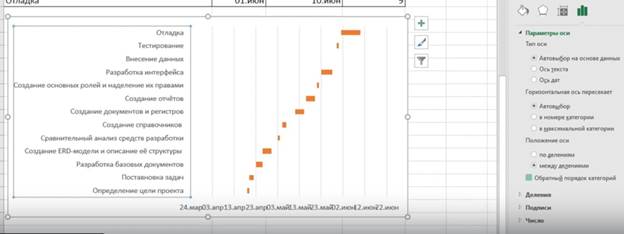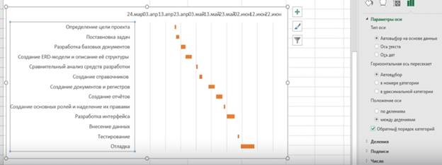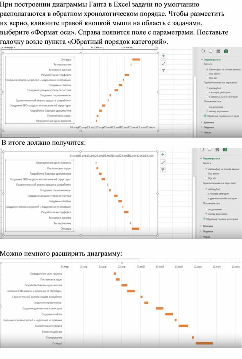 При построении диаграммы Ганта в Excel задачи по умолчанию располагаются в обратном хронологическом порядке. Чтобы разместить их верно, кликните правой кнопкой мыши на область с задачами, выберите «Формат оси». Справа появится поле с параметрами. Поставьте галочку возле пункта «Обратный порядок категорий».