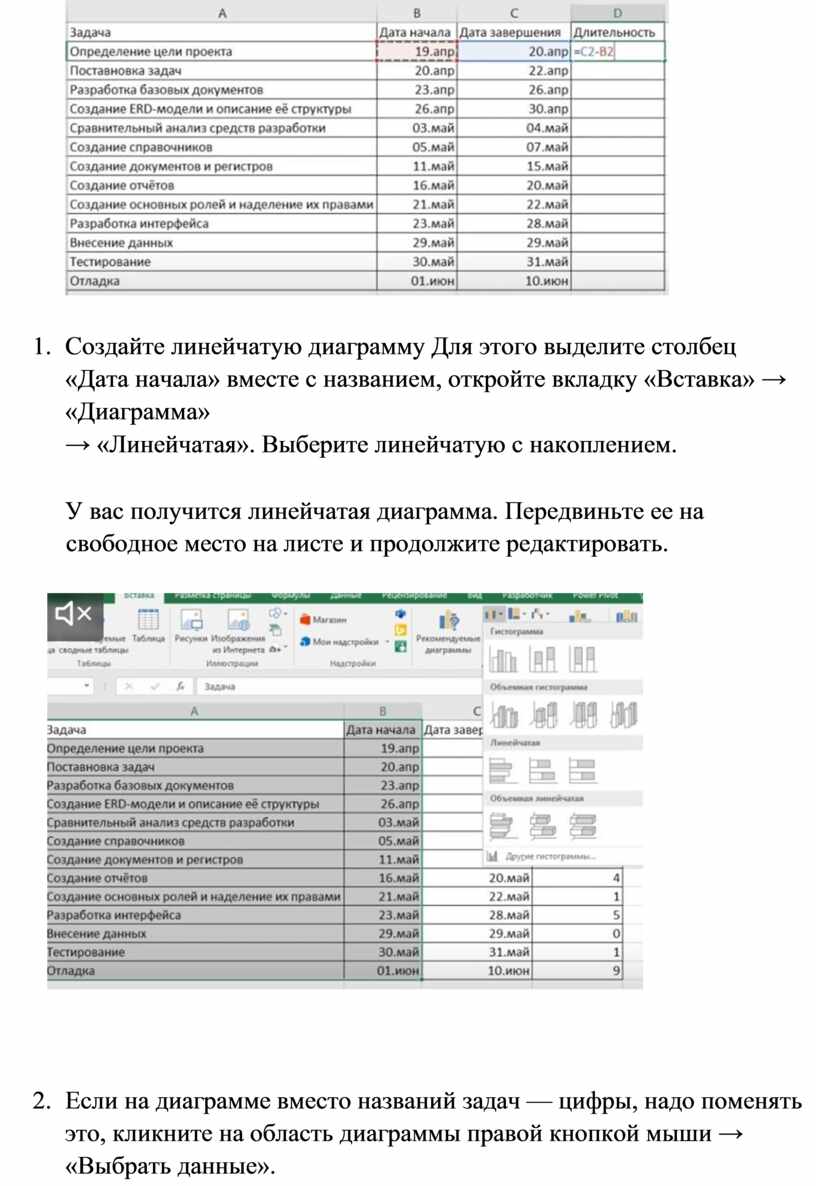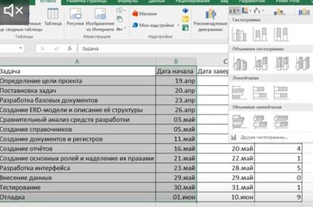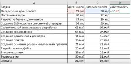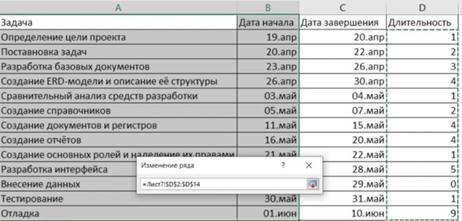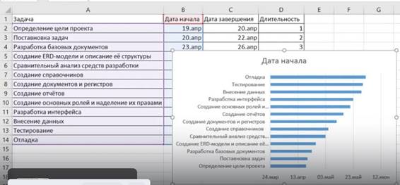 Создание таблицы с данными о проекте: задачи, дата начала, дата завершения, длительность.