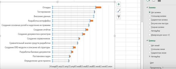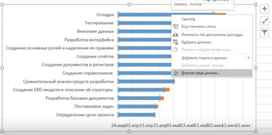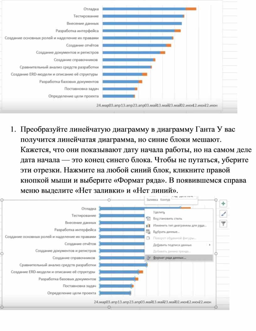 5. Преобразуйте линейчатую диаграмму в диаграмму Ганта У вас получится линейчатая диаграмма, но синие блоки мешают. Кажется, что они показывают дату начала работы, но на самом деле дата начала — это конец синего блока. Чтобы не путаться, уберите эти отрезки. Нажмите на любой синий блок, кликните правой кнопкой мыши и выберите «Формат ряда». В появившемся справа меню выделите «Нет заливки» и «Нет линий».