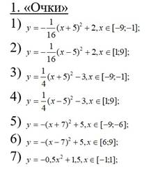 у1= -1/18х2 + 12, х[-12;12] y2= -1/8х2 +6, х[-4;4] y3= -1/8(x+8)2 + 6, х[-12; -4] y4= -1/8(x-8)2 + 6, х[4; 12] y5= 2(x+3)2 – 9, х[-4;0] y6=1.5(x+3)2 – 10, х[-4;0]