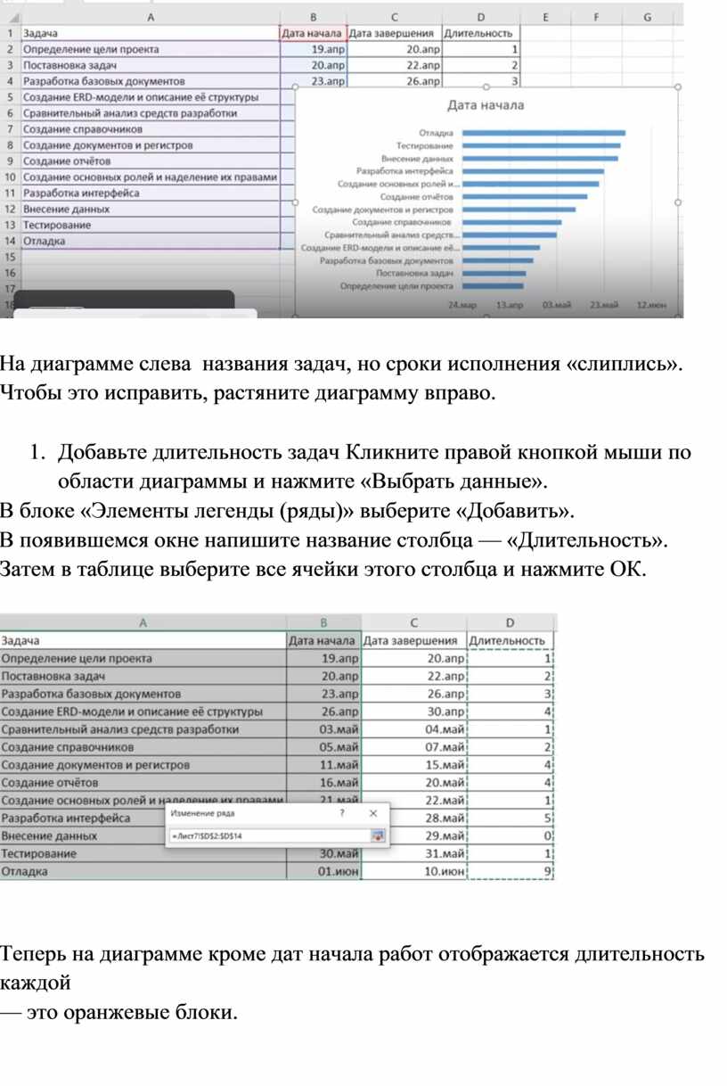На диаграмме слева названия задач, но сроки исполнения «слиплись». Чтобы это исправить, растяните диаграмму вправо.