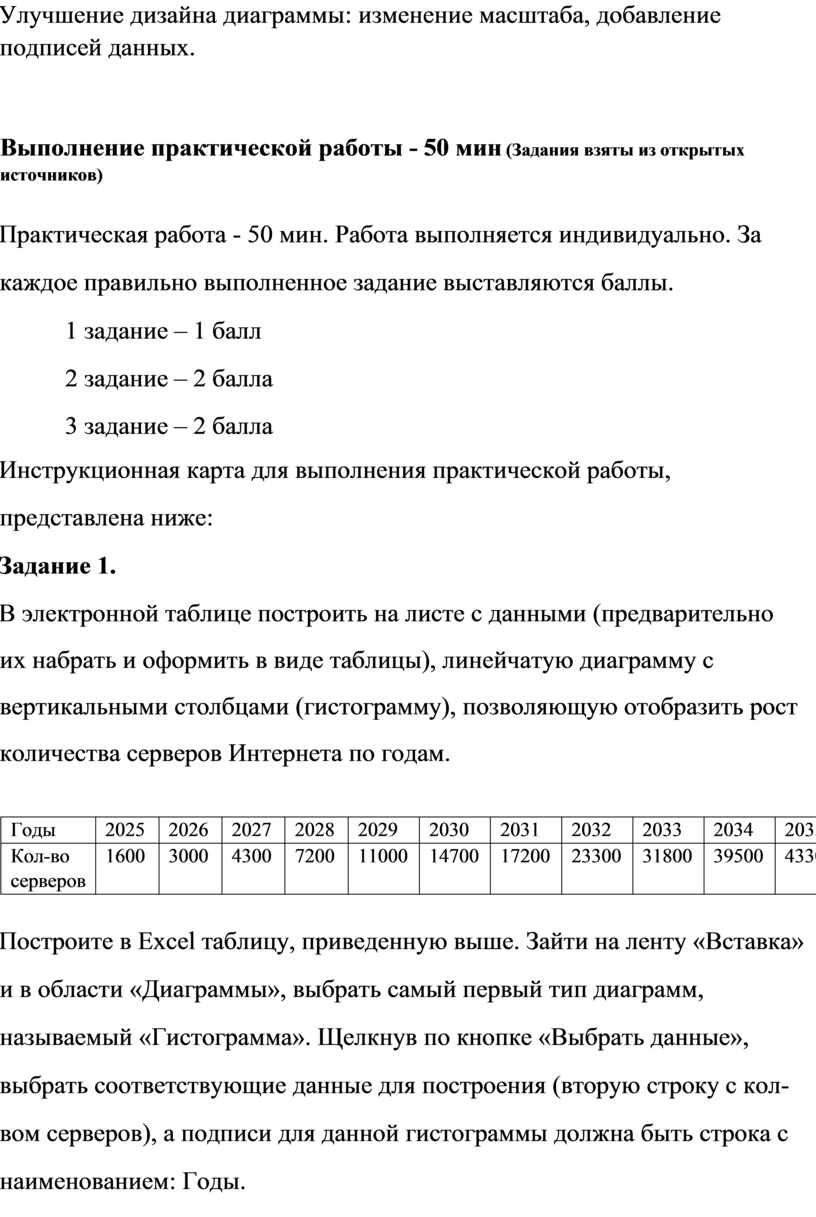 В электронной таблице построить на листе с данными (предварительно их набрать и оформить в виде таблицы), линейчатую диаграмму с вертикальными столбцами (гистограмму), позволяющую отобразить рост количества серверов Интернета по годам.