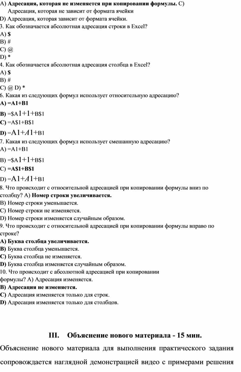 Тест по теме: "Относительная и абсолютная адресации в MS Excel" 1. Что такое относительная адресация в Excel?