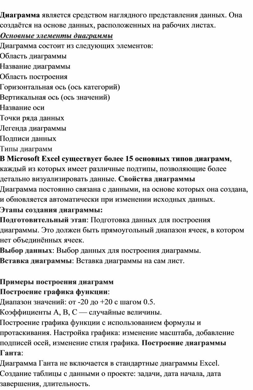 Диаграмма является средством наглядного представления данных. Она создаётся на основе данных, расположенных на рабочих листах.