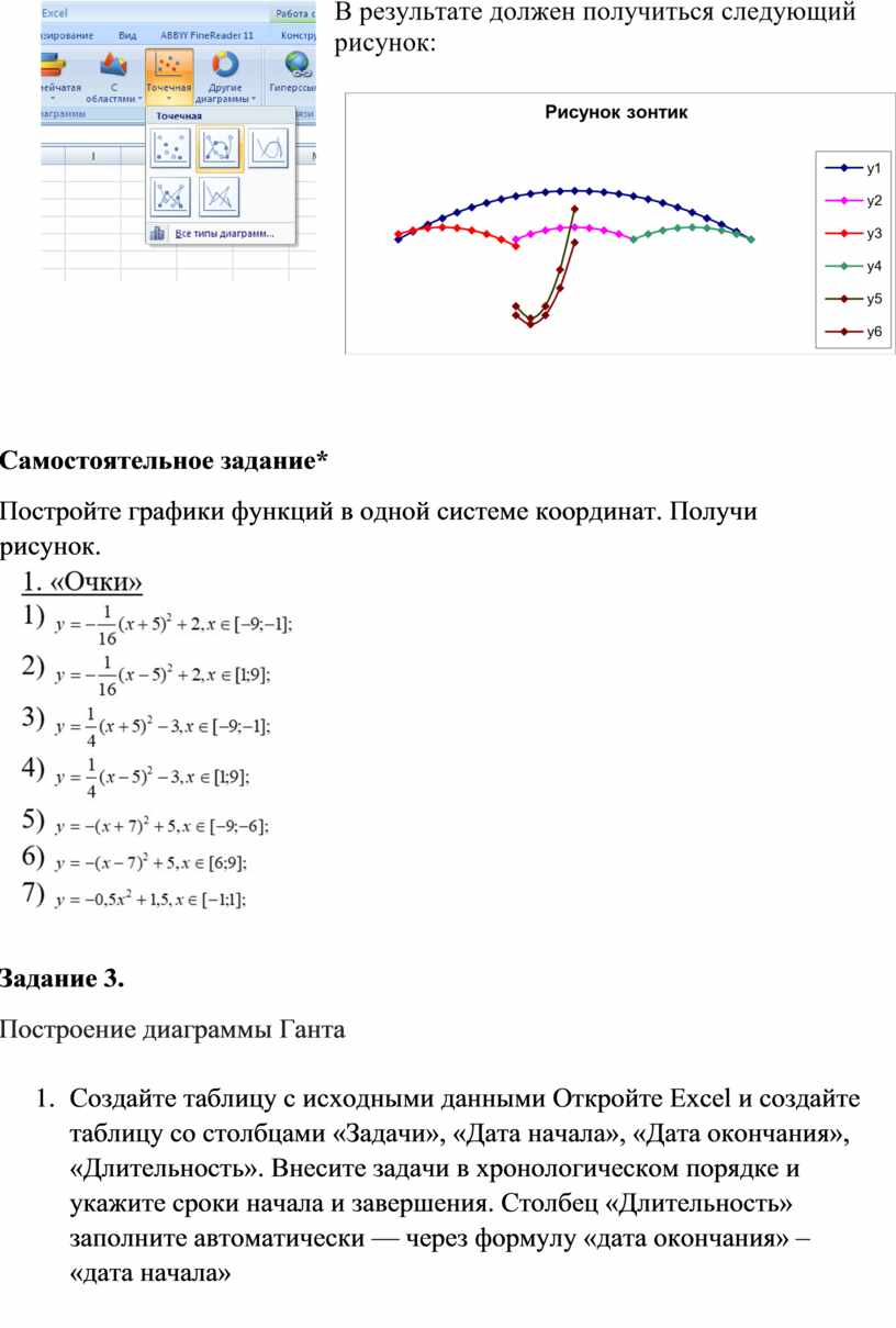 Построение графика функции с использованием формулы и протаскивания. Настройка графика: изменение масштаба, добавление подписей осей, изменение стиля графика. Построение диаграммы Ганта: