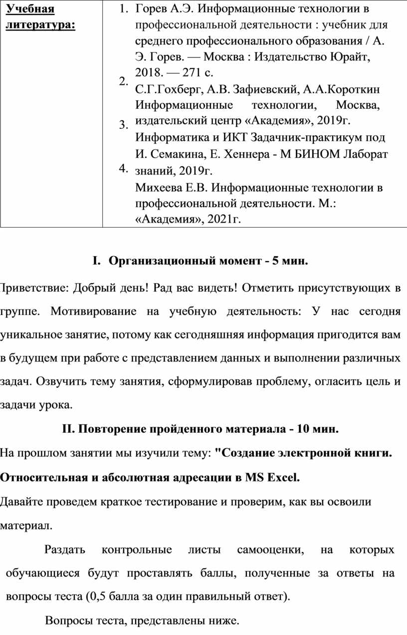 среднего профессионального образования / А. Э. Горев. — Москва : Издательство Юрайт, 2018. — 271 с. С.Г.Гохберг, А.В. Зафиевский, А.А.Короткин Информационные технологии, Москва, издательский центр «Академия», 2019г. Информатика и ИКТ Задачник-практикум под ред. И. Семакина, Е. Хеннера - М БИНОМ Лаборатория знаний, 2019г. Михеева Е.В. Информационные технологии в профессиональной деятельности. М.: «Академия», 2021г. |