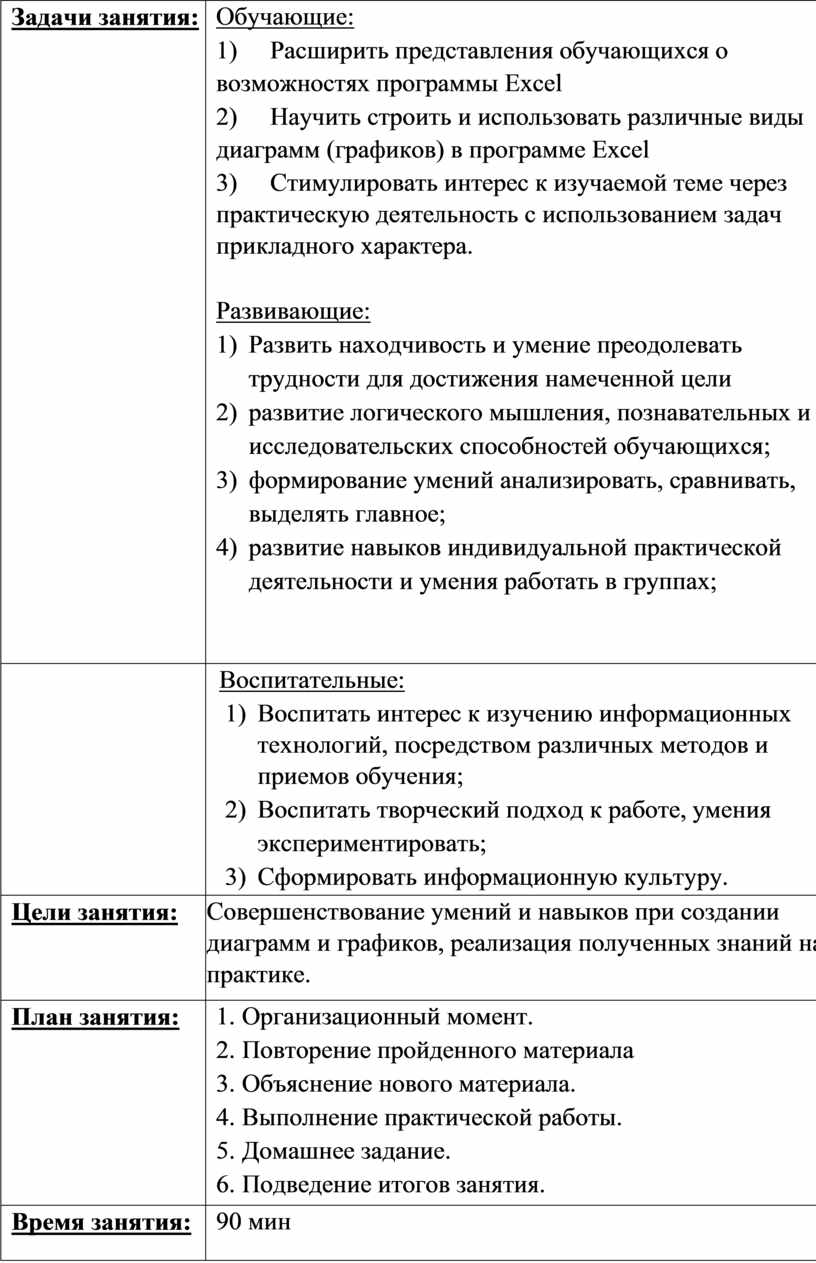 Обучающие: 1) Расширить представления обучающихся о возможностях программы Excel 2) Научить строить и использовать различные виды диаграмм (графиков) в программе Excel 3) Стимулировать интерес к изучаемой теме через практическую деятельность с использованием задач прикладного характера.