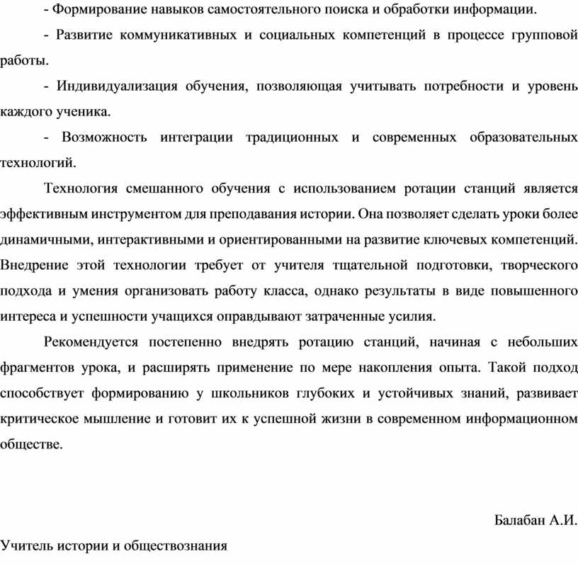 Рекомендуется постепенно внедрять ротацию станций, начиная с небольших фрагментов урока, и расширять применение по мере накопления опыта. Такой подход способствует формированию у школьников глубоких и устойчивых знаний, развивает критическое мышление и готовит их к успешной жизни в современном информационном обществе.