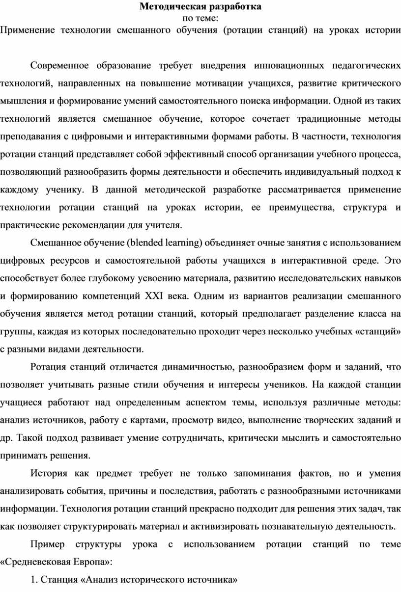 Современное образование требует внедрения инновационных педагогических технологий, направленных на повышение мотивации учащихся, развитие критического мышления и формирование умений самостоятельного поиска информации. Одной из таких технологий является смешанное обучение, которое сочетает традиционные методы преподавания с цифровыми и интерактивными формами работы. В частности, технология ротации станций представляет собой эффективный способ организации учебного процесса, позволяющий разнообразить формы деятельности и обеспечить индивидуальный подход к каждому ученику. В данной методической разработке рассматривается применение технологии ротации станций на уроках истории, ее преимущества, структура и практические рекомендации для учителя.