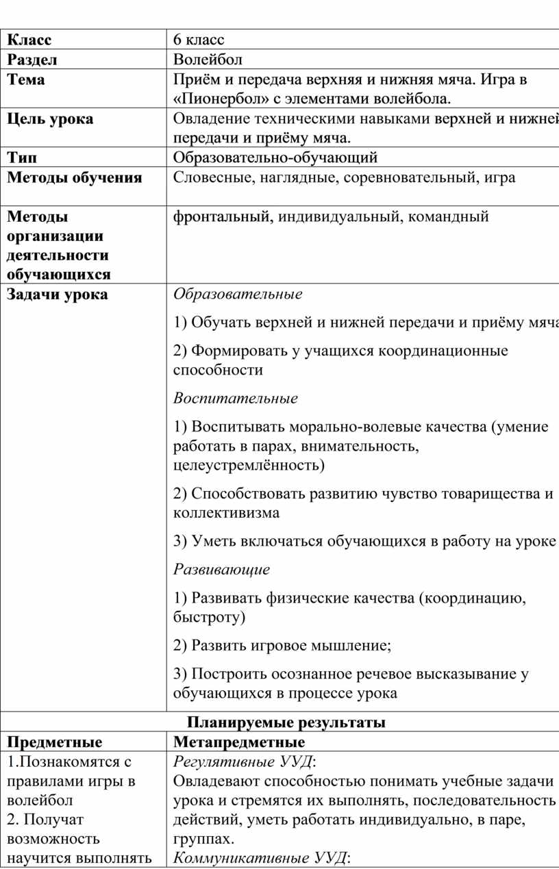 Образовательные 1) Обучать верхней и нижней передачи и приёму мяча 2) Формировать у учащихся координационные способности Воспитательные 1) Воспитывать морально-волевые качества (умение работать в парах, внимательность, целеустремлённость) 2) Способствовать развитию чувство товарищества и коллективизма 3) Уметь включаться обучающихся в работу на уроке Развивающие 1) Развивать физические качества (координацию, быстроту) 2) Развить игровое мышление; 3) Построить осознанное речевое высказывание у обучающихся в процессе урока |