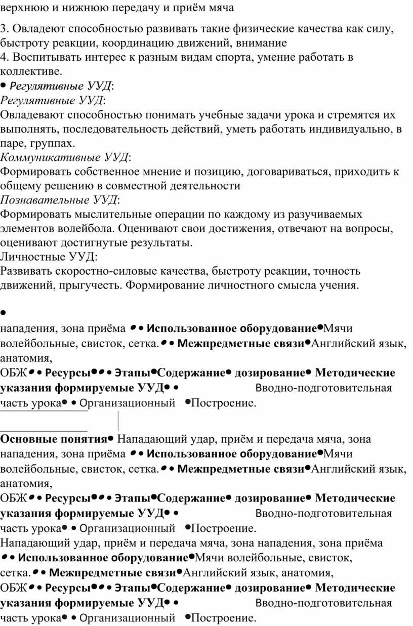 Регулятивные УУД: Овладевают способностью понимать учебные задачи урока и стремятся их выполнять, последовательность действий, уметь работать индивидуально, в паре, группах. Коммуникативные УУД: Формировать собственное мнение и позицию, договариваться, приходить к общему решению в совместной деятельности Познавательные УУД: Формировать мыслительные операции по каждому из разучиваемых элементов волейбола. Оценивают свои достижения, отвечают на вопросы, оценивают достигнутые результаты. Личностные УУД: Развивать скоростно-силовые качества, быстроту реакции, точность движений, прыгучесть. Формирование личностного смысла учения.
