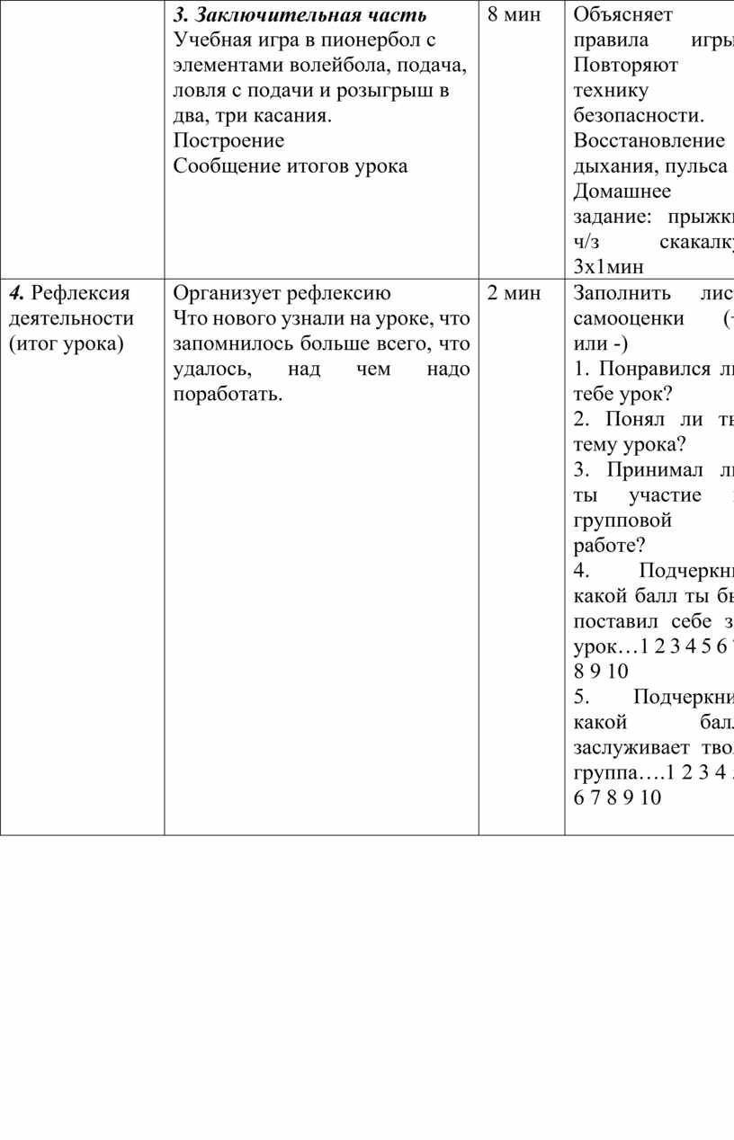 3. Заключительная часть Учебная игра в пионербол с элементами волейбола, подача, ловля с подачи и розыгрыш в два, три касания. Построение Сообщение итогов урока