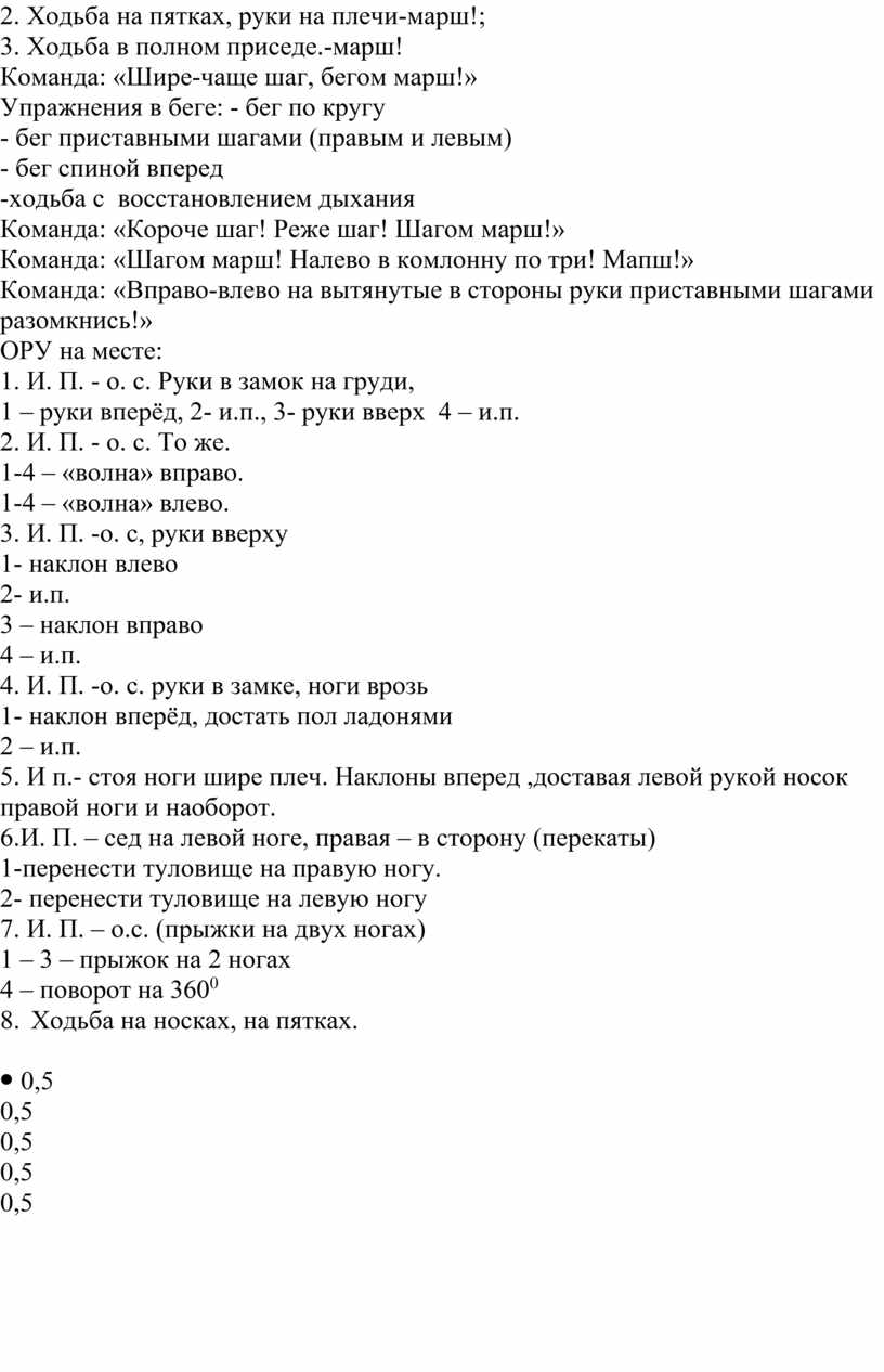 Упражнения в ходьбе: 1. Ходьба на носках, руки на пояс.-Марш; 2. Ходьба на пятках, руки на плечи-марш!; 3. Ходьба в полном приседе.-марш! Команда: «Шире-чаще шаг, бегом марш!» Упражнения в беге: - бег по кругу - бег приставными шагами (правым и левым) - бег спиной вперед -ходьба с восстановлением дыхания Команда: «Короче шаг! Реже шаг! Шагом марш!» Команда: «Шагом марш! Налево в комлонну по три! Мапш!» Команда: «Вправо-влево на вытянутые в стороны руки приставными шагами разомкнись!» ОРУ на месте: 1. И. П. - о. с. Руки в замок на груди, 1 – руки вперёд, 2- и.п., 3- руки вверх 4 – и.п. 2. И. П. - о. с. То же. 1-4 – «волна» вправо. 1-4 – «волна» влево. 3. И. П. -о. с, руки вверху 1- наклон влево 2- и.п. 3 – наклон вправо 4 – и.п. 4. И. П. -о. с. руки в замке, ноги врозь 1- наклон вперёд, достать пол ладонями 2 – и.п. 5. И п.- стоя ноги шире плеч. Наклоны вперед ,доставая левой рукой носок правой ноги и наоборот. 6.И. П. – сед на левой ноге, правая – в сторону (перекаты) 1-перенести туловище на правую ногу. 2- перенести туловище на левую ногу 7. И. П. – о.с. (прыжки на двух ногах) 1 – 3 – прыжок на 2 ногах 4 – поворот на 3600 8. Ходьба на носках, на пятках.