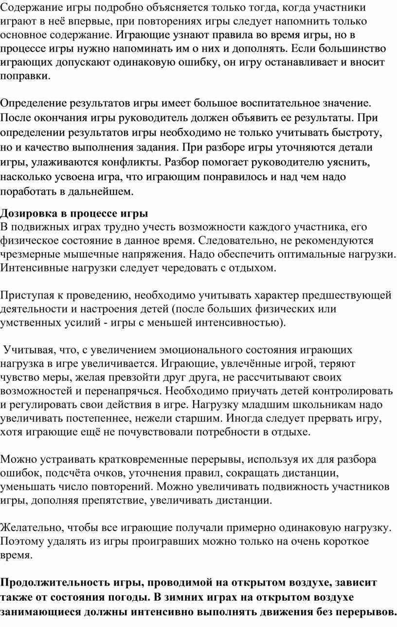 Продолжительность игры, проводимой на открытом воздухе, зависит также от состояния погоды. В зимних играх на открытом воздухе занимающиеся должны интенсивно выполнять движения без перерывов. Нельзя давать играющим сильные нагрузки с последующим отдыхом, чтобы не вызвать испарину, а затем быстрое охлаждение. Зимние игры должны быть кратковременными.