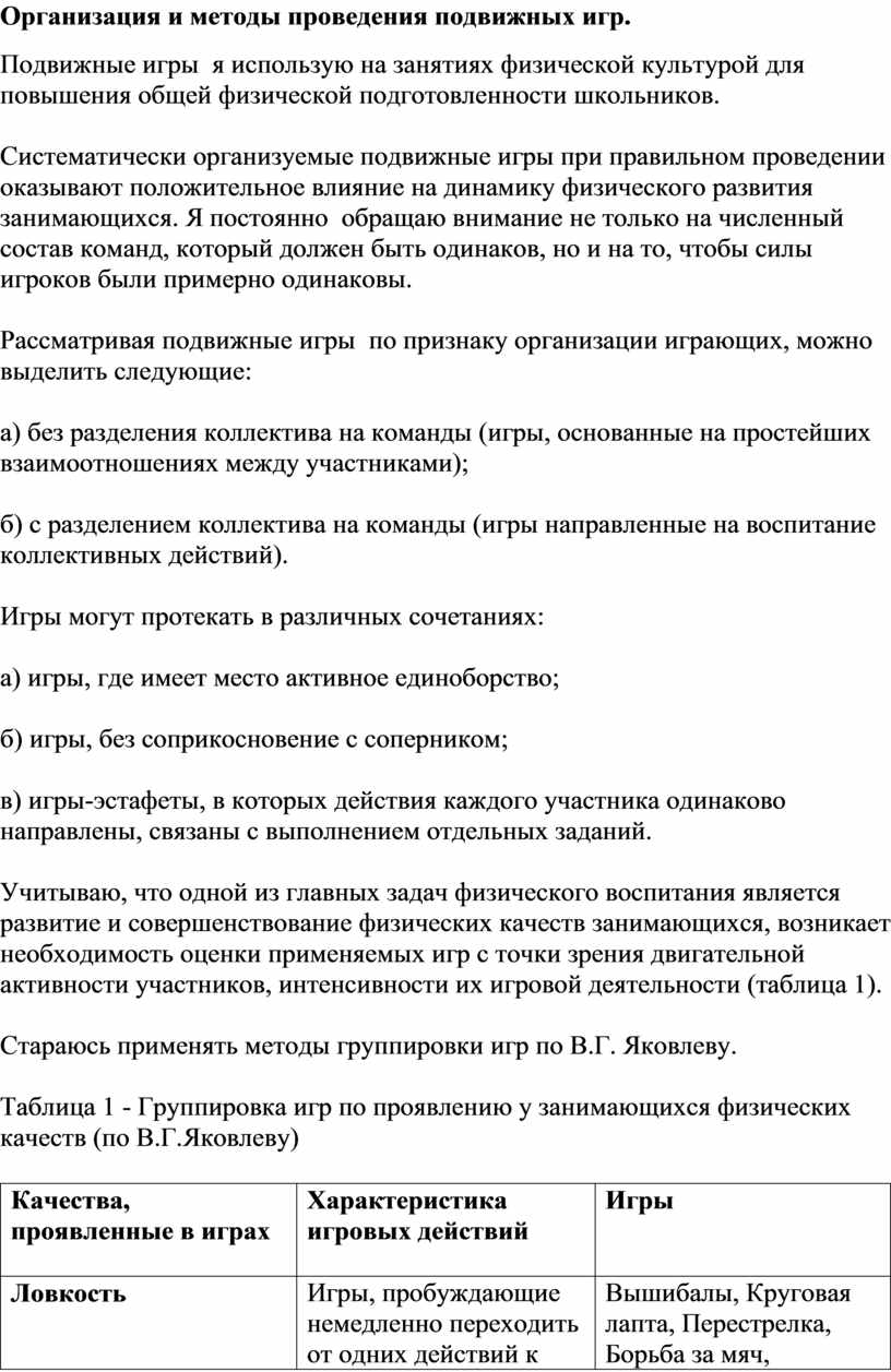 Таблица 1 - Группировка игр по проявлению у занимающихся физических качеств (по В.Г.Яковлеву)