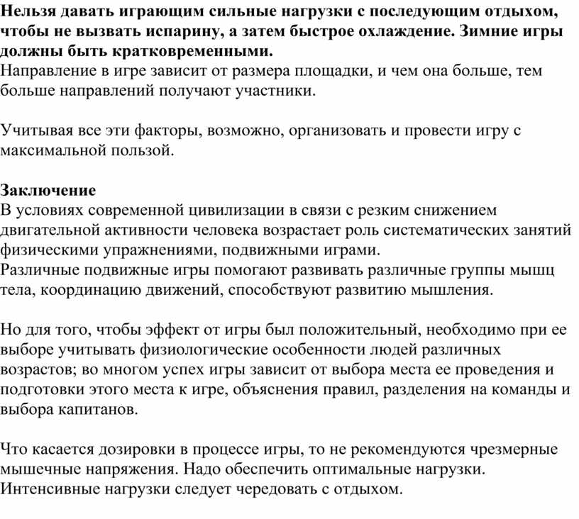 В подвижных играх трудно учесть возможности каждого участника, его физическое состояние в данное время. Следовательно, не рекомендуются чрезмерные мышечные напряжения. Надо обеспечить оптимальные нагрузки. Интенсивные нагрузки следует чередовать с отдыхом.