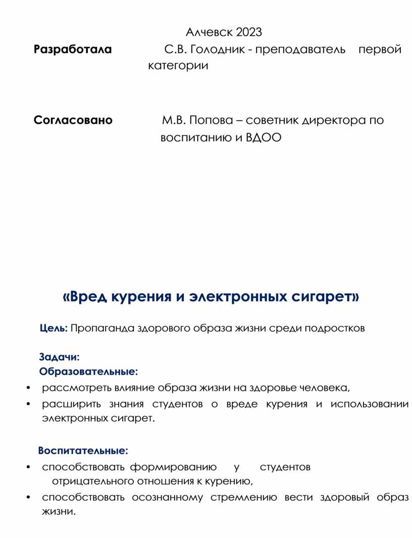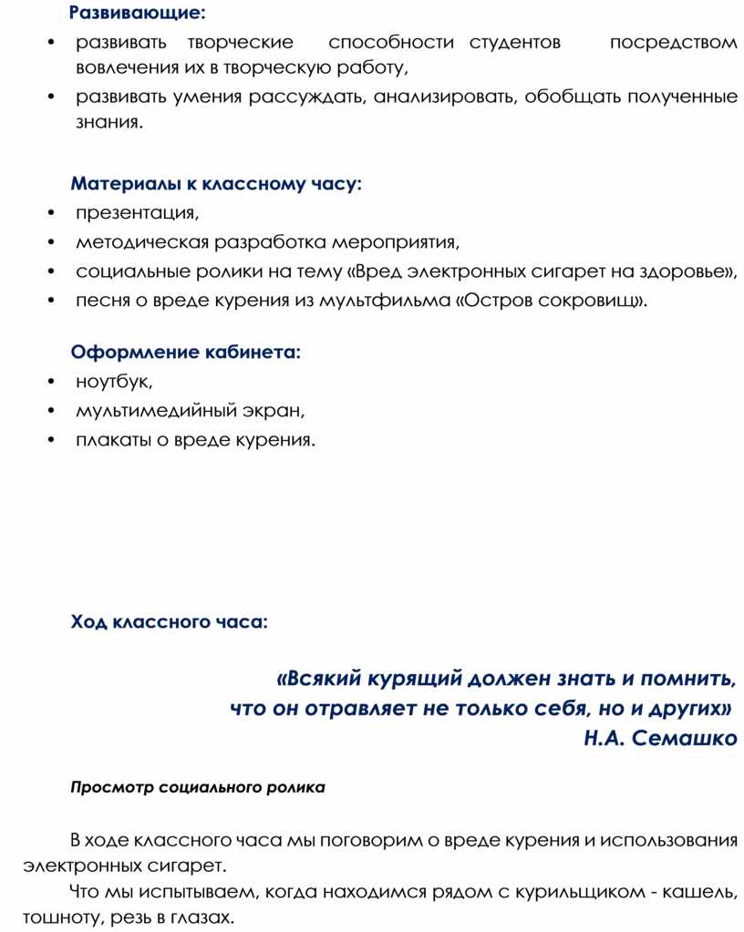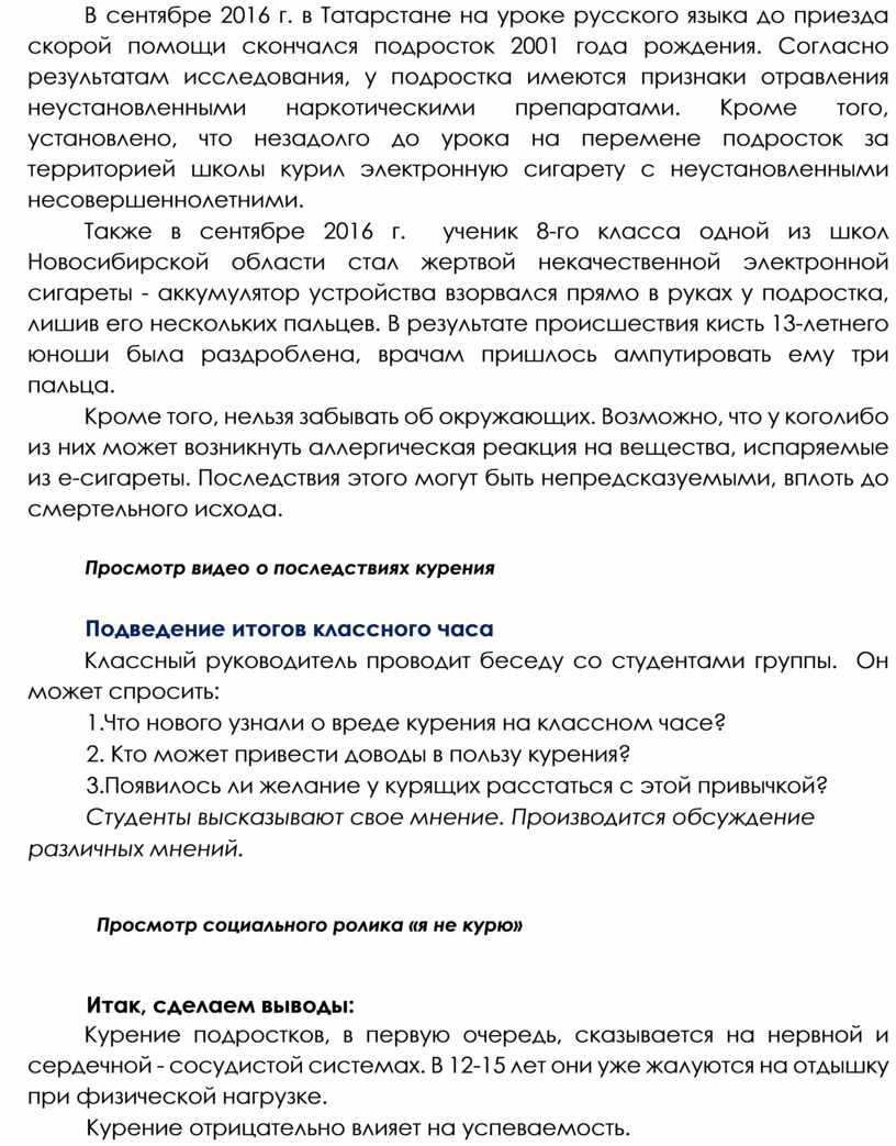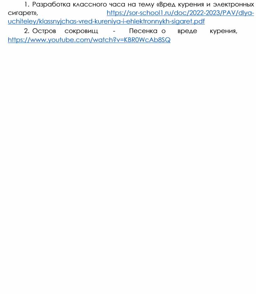 3. Разработка классного часа на тему «Вред курения и электронных сигарет», https://sor-school1.ru/doc/2022-2023/PAV/dlya-uchiteley/klassnyjchas-vred-kureniya-i-ehlektronnykh-sigaret.pdf