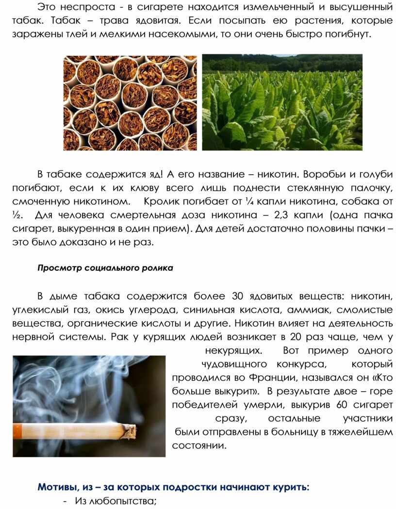 В табаке содержится яд! А его название – никотин. Воробьи и голуби погибают, если к их клюву всего лишь поднести стеклянную палочку, смоченную никотином. Кролик погибает от ¼ капли никотина, собака от ½. Для человека смертельная доза никотина – 2,3 капли (одна пачка сигарет, выкуренная в один прием). Для детей достаточно половины пачки – это было доказано и не раз.