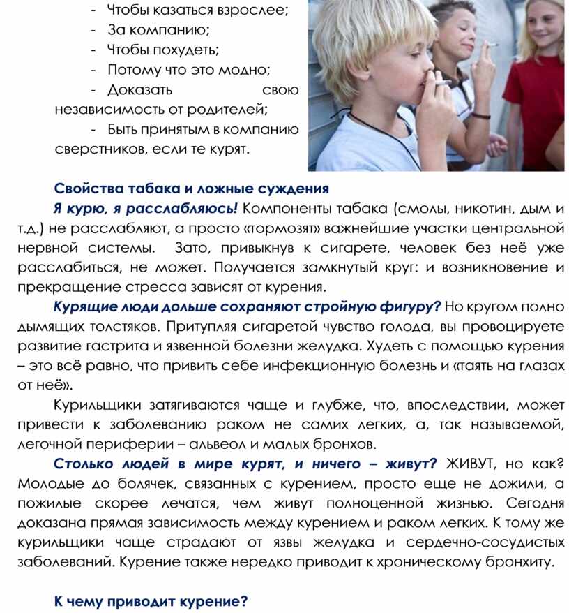 Курение и подросток несовместимы. Это годы роста как физического, так и умственного. Организму нужно много сил, чтобы справиться со всеми нагрузками. Как известно, навыки, привычки, усвоенные в этом возрасте, самые прочные. Это относиться не только к полезным, но и к вредным привычкам. Чем раньше дети, подростки, юноши, девушки познакомятся с курением и начнут курить, тем быстрее привыкнут к нему, и в дальнейшем отказаться от курения будет очень трудно.