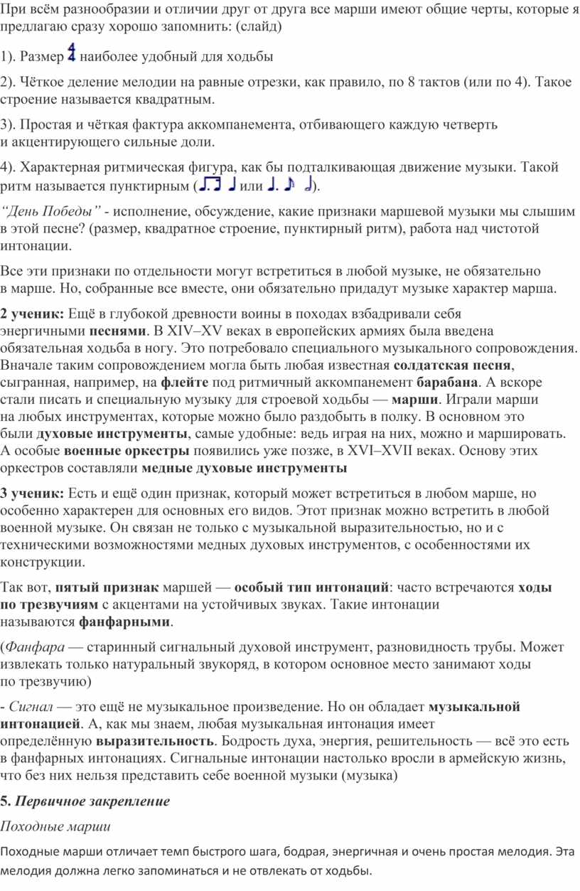 3 ученик: Есть и ещё один признак, который может встретиться в любом марше, но особенно характерен для основных его видов. Этот признак можно встретить в любой военной музыке. Он связан не только с музыкальной выразительностью, но и с техническими возможностями медных духовых инструментов, с особенностями их конструкции.