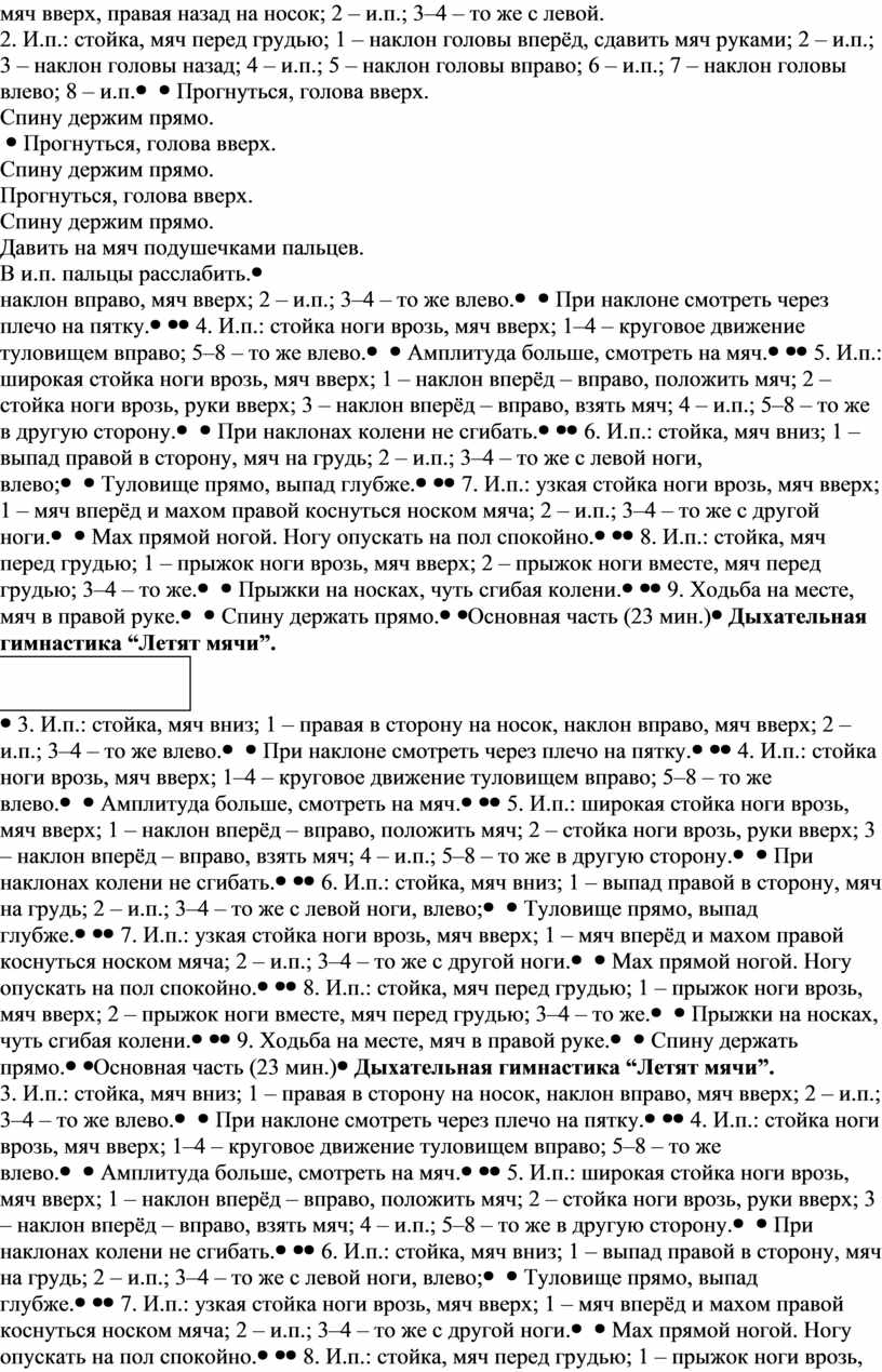 1. И.п.: стойка, мяч вниз; 1 – мяч вверх, правая назад на носок; 2 – и.п.; 3–4 – то же с левой. 2. И.п.: стойка, мяч перед грудью; 1 – наклон головы вперёд, сдавить мяч руками; 2 – и.п.; 3 – наклон головы назад; 4 – и.п.; 5 – наклон головы вправо; 6 – и.п.; 7 – наклон головы влево; 8 – и.п. |