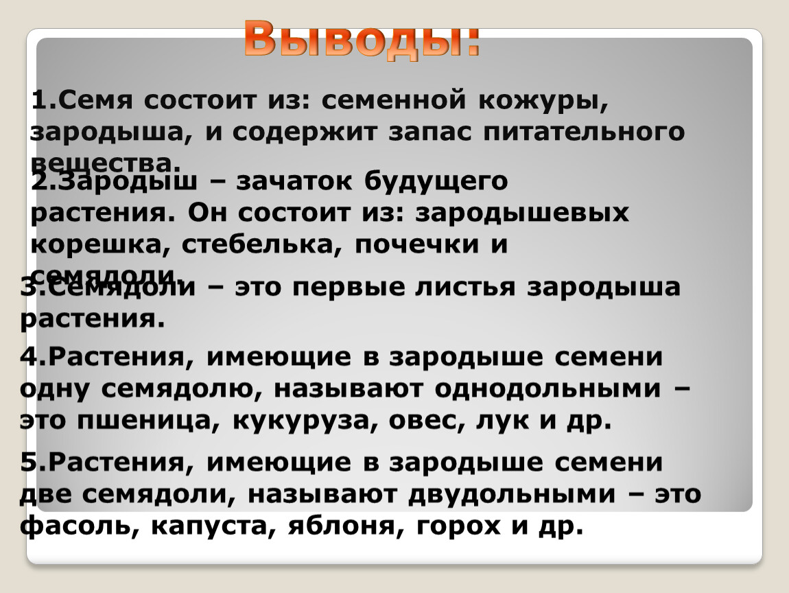 4.Растения, имеющие в зародыше семени одну семядолю, называют однодольными – это пшеница, кукуруза, овес, лук и др.