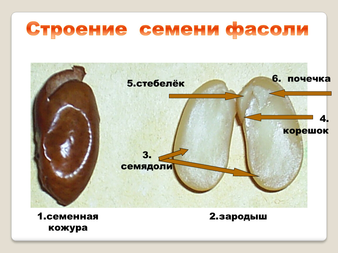 7. Зародыш семени двудольных растений содержит 2семядоли, корешок, стебелек, почечка. | |