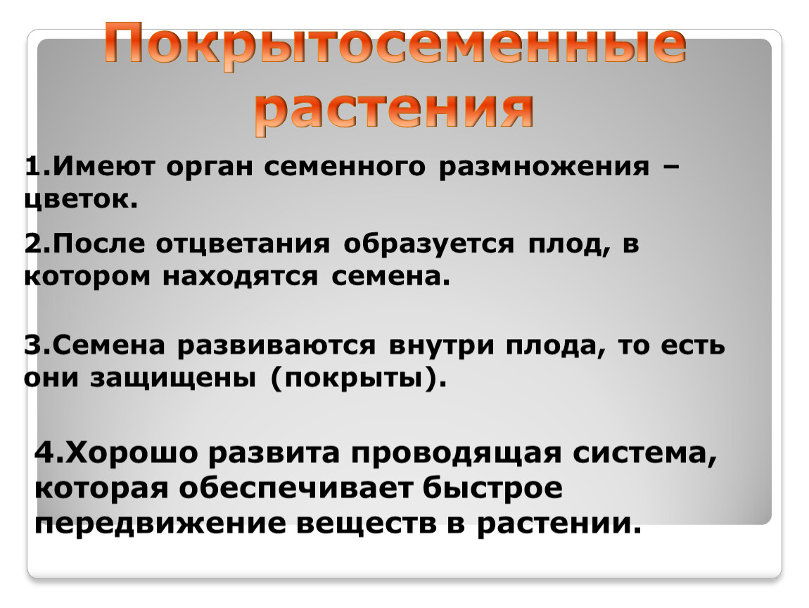 3.Семена развиваются внутри плода, то есть они защищены (покрыты).
