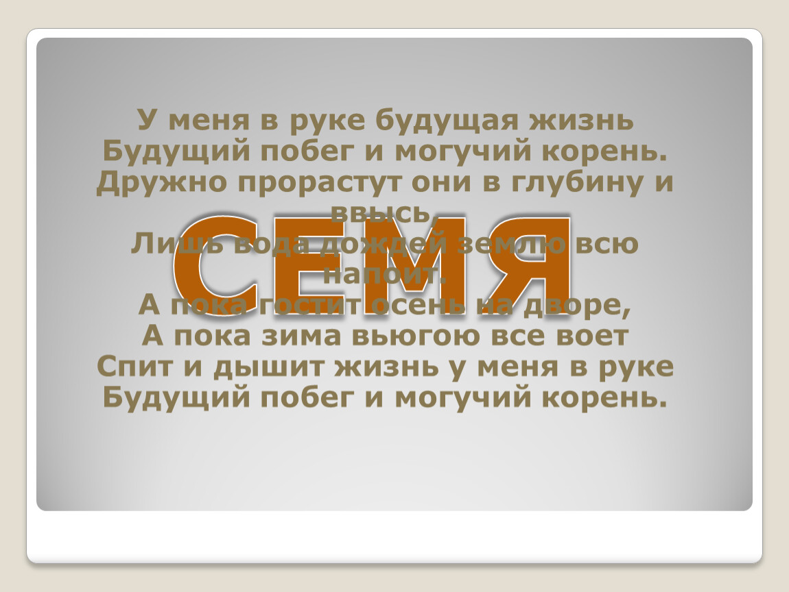 У меня в руке будущая жизньБудущий побег и могучий корень.Дружно прорастут они в глубину и ввысь,Лишь вода дождей землю всю напоит.А пока гостит осень на дворе, А пока зима вьюгою все воет Спит и дышит жизнь у меня в рукеБудущий побег и могучий корень.