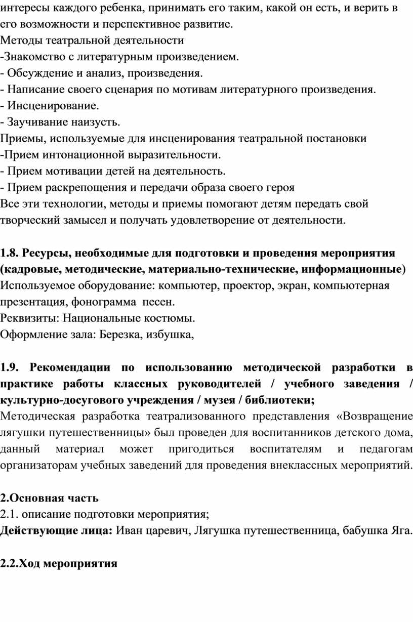 1.6. форма проведения мероприятия и обоснование ее выбора. Мероприятие разработано в форме театрализованного представления. Театрализация – это область искусства и обращения к эмоциональной сфере детского восприятия. В более простой форме, через театральную постановку в художественной форме закладывается в детях гражданско-патриотические качества, чтобы они любили то место где живут, знали историю своей страны, с уважение относились к людям.