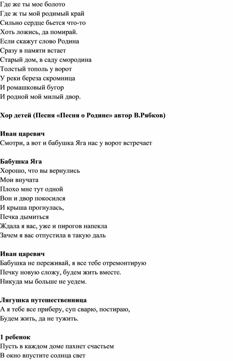 Действующие лица: Иван царевич, Лягушка путешественница, бабушка Яга.