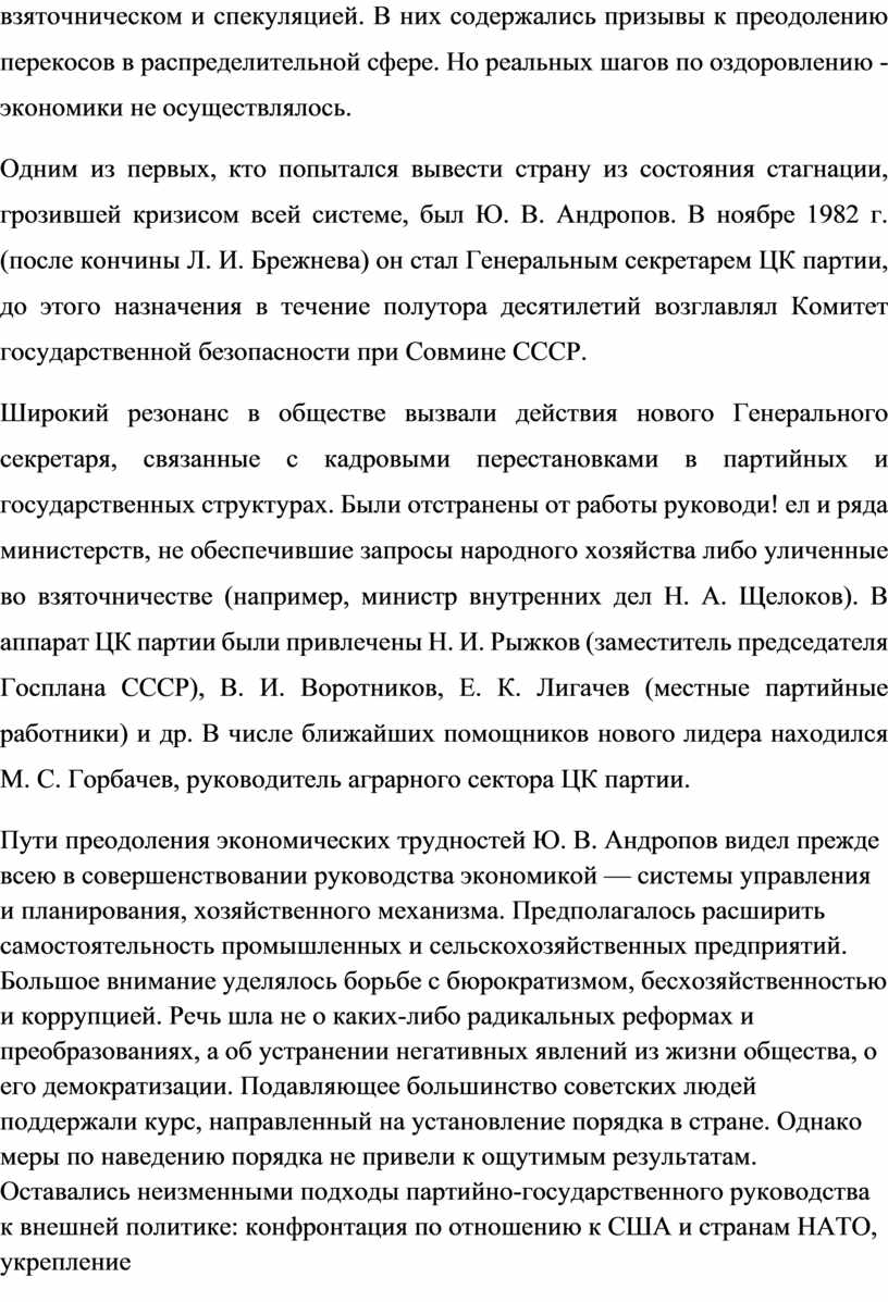 Общество накануне перестройки. Неэффективность экономики, деформация общественно-политической жизни, социальная апатия населения вызывали глубокую озабоченность в руководстве страны. Принимались меры с целью преодоления негативных явлений в экономике и политике. В официальных документах декларировалась необходимость борьбы со взяточническом и спекуляцией. В них содержались призывы к преодолению перекосов в распределительной сфере. Но реальных шагов по оздоровлению -экономики не осуществлялось.