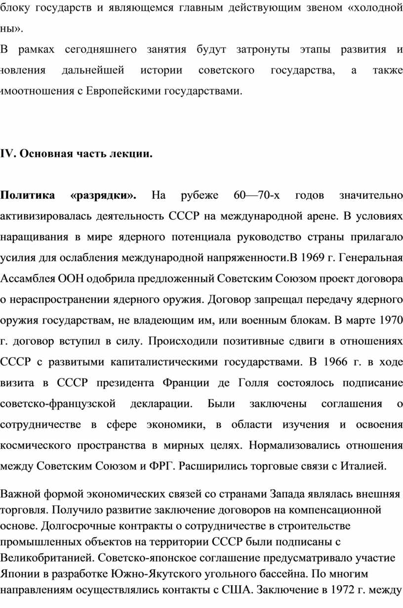 Политика «разрядки». На рубеже 60—70-х годов значительно активизировалась деятельность СССР на международной арене. В условиях наращивания в мире ядерного потенциала руководство страны прилагало усилия для ослабления международной напряженности.В 1969 г. Генеральная Ассамблея ООН одобрила предложенный Советским Союзом проект договора о нераспространении ядерного оружия. Договор запрещал передачу ядерного оружия государствам, не владеющим им, или военным блокам. В марте 1970 г. договор вступил в силу. Происходили позитивные сдвиги в отношениях СССР с развитыми капиталистическими государствами. В 1966 г. в ходе визита в СССР президента Франции де Голля состоялось подписание советско-французской декларации. Были заключены соглашения о сотрудничестве в сфере экономики, в области изучения и освоения космического пространства в мирных целях. Нормализовались отношения между Советским Союзом и ФРГ. Расширились торговые связи с Италией.