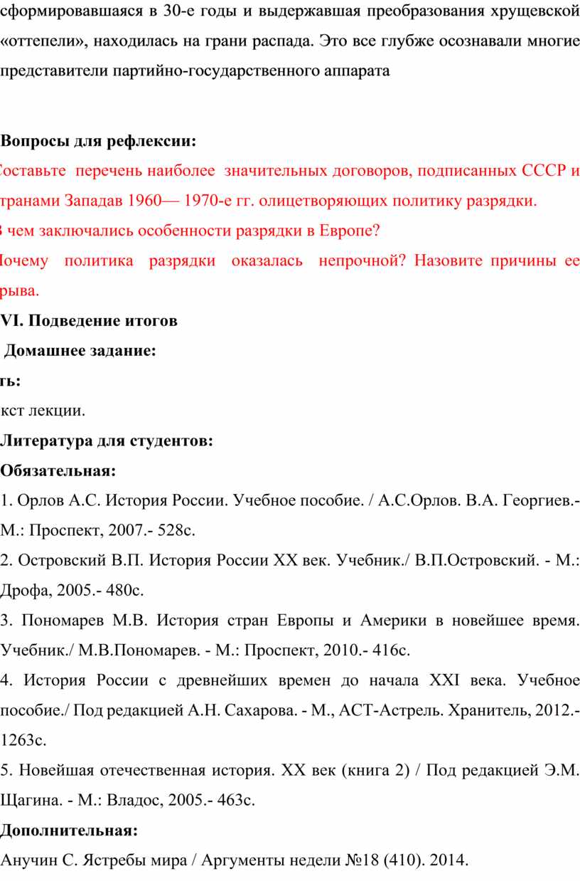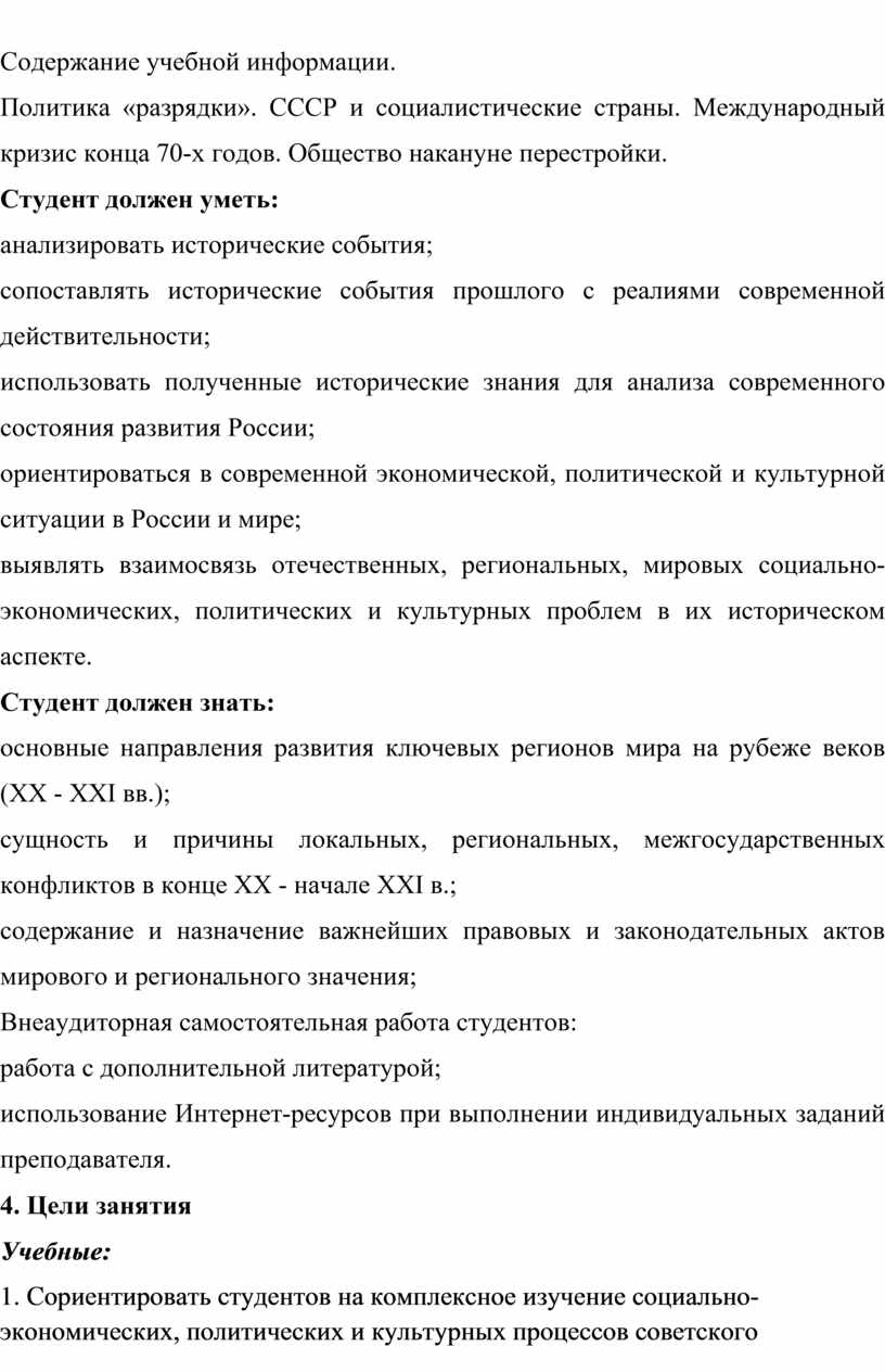 Успешное усвоение студентами данной учебной темы обеспечит понимание внутриполитических процессов в СССР, их влияние на международные отношения и дальнейшую судьбу как советского государства, так и Российской Федерации, как правопреемницы СССР.
