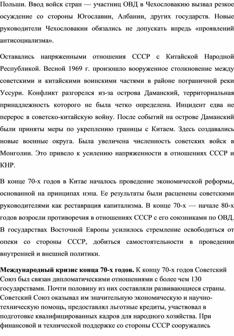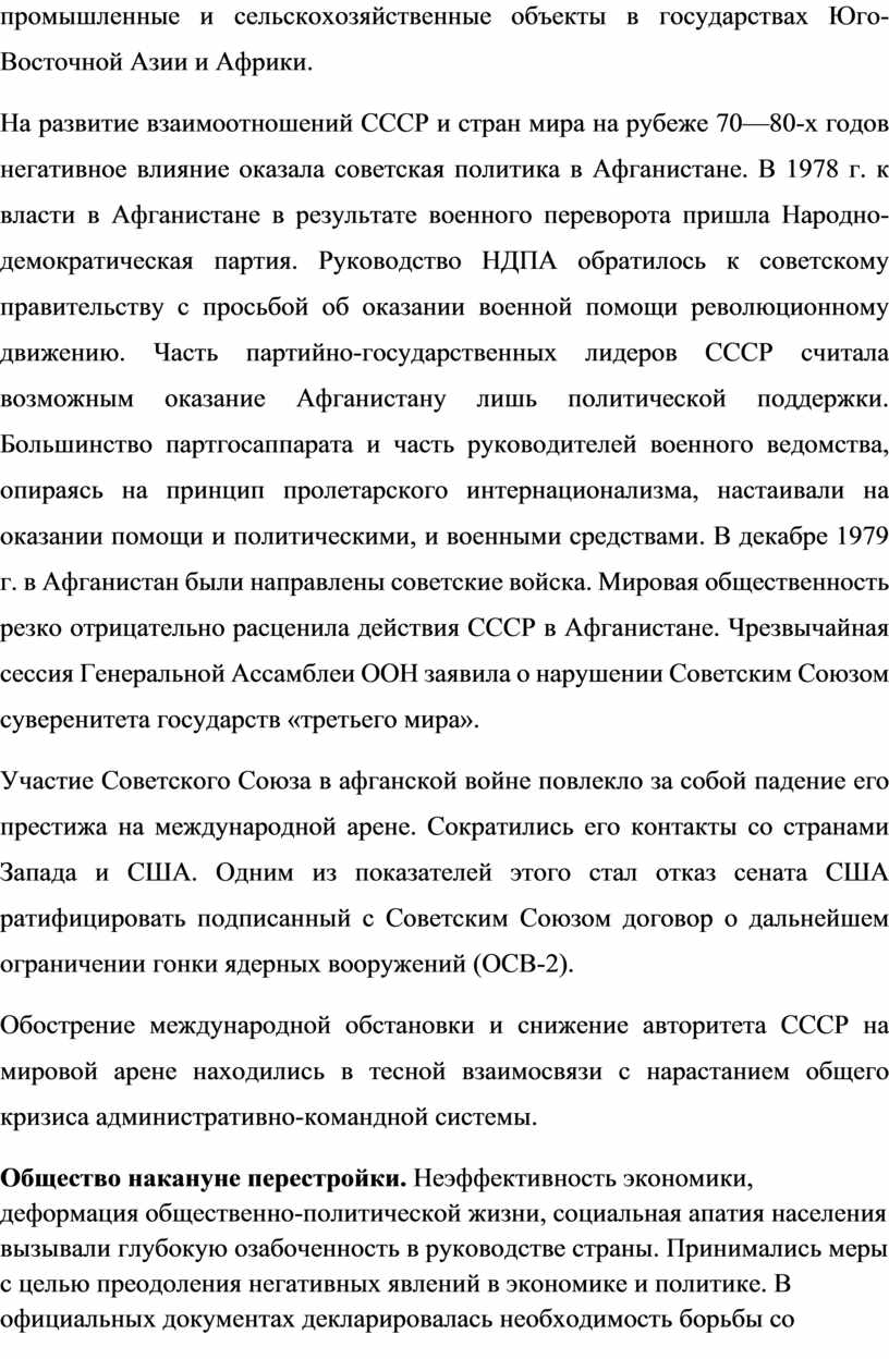 Международный кризис конца 70-х годов. К концу 70-х годов Советский Союз был связан дипломатическими отношениями с более чем 130 государствами. Почти половину из них составляли развивающиеся страны. Советский Союз оказывал им значительную экономическую и научно-техническую помощь, предоставлял льготные кредиты, участвовал в подготовке квалифицированных кадров для народного хозяйства. При финансовой и технической поддержке со стороны СССР сооружались промышленные и сельскохозяйственные объекты в государствах Юго-Восточной Азии и Африки.