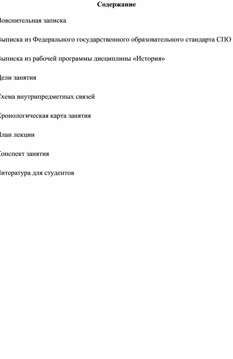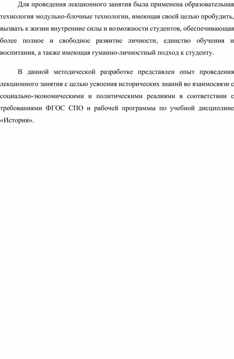 В данной методической разработке представлен опыт проведения лекционного занятия с целью усвоения исторических знаний во взаимосвязи с социально-экономическими и политическими реалиями в соответствии с требованиями ФГОС СПО и рабочей программы по учебной дисциплине «История».