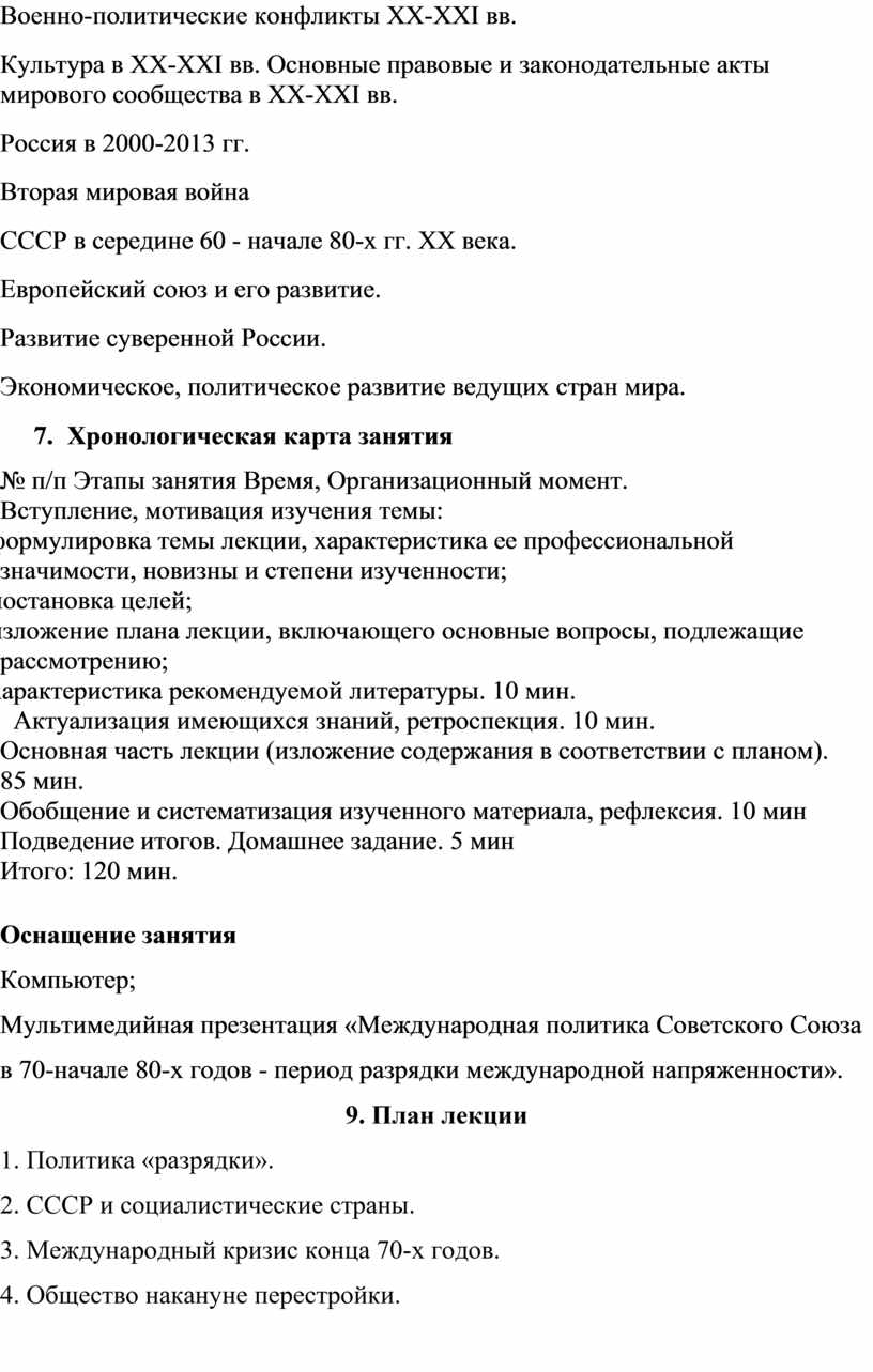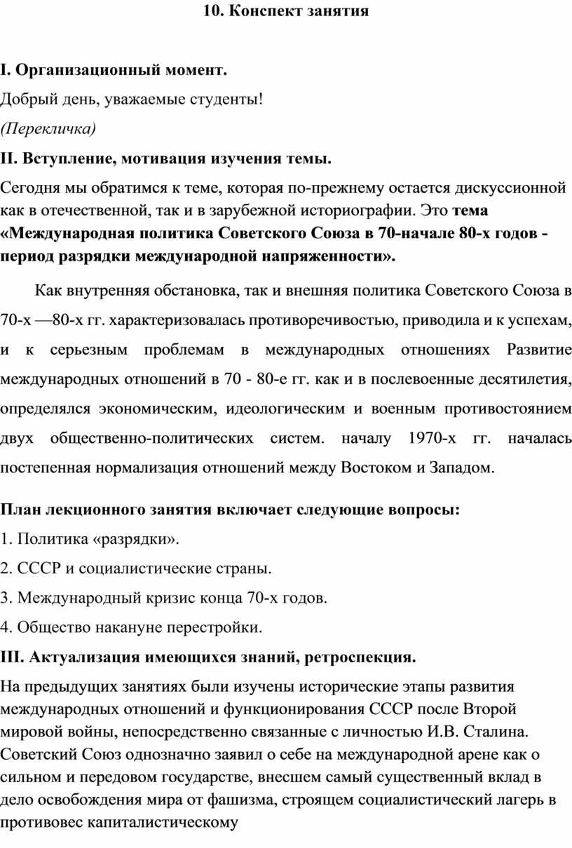 В ходе занятия рассматриваются проблемы Внешней политики Советского Союза в конце 70-х начале 80-х гг. XX в. Понятия «разрядки», причины внешних конфликтов и урегулирование их.