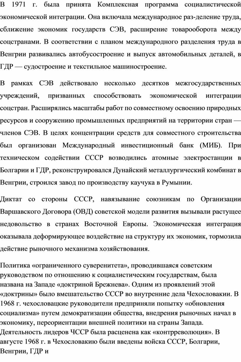 В 1971 г. была принята Комплексная программа социалистической экономической интеграции. Она включала международное раз-деление труда, сближение экономик государств СЭВ, расширение товарооборота между соцстранами. В соответствии с планом международного разделения труда в Венгрии развивались автобусостроение и выпуск автомобильных деталей, в ГДР — судостроение и текстильное машиностроение.