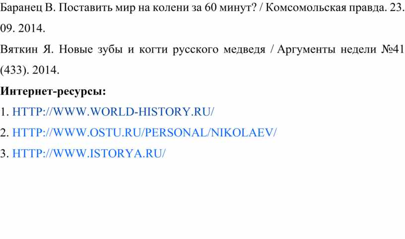 2. Баранец В. Поставить мир на колени за 60 минут? / Комсомольская правда. 23. 09. 2014.