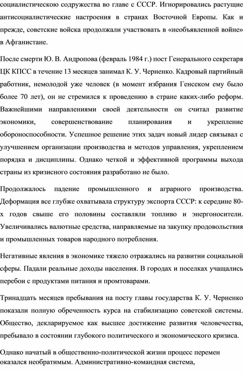 После смерти Ю. В. Андропова (февраль 1984 г.) пост Генерального секретаря ЦК КПСС в течение 13 месяцев занимал К. У. Черненко. Кадровый партийный работник, немолодой уже человек (в момент избрания Генсеком ему было более 70 лет), он не стремился к проведению в стране каких-либо реформ. Важнейшими направлениями своей деятельности он считал развитие экономики, совершенствование планирования и укрепление обороноспособности. Успешное решение этих задач новый лидер связывал с улучшением организации производства и методов управления, укреплением порядка и дисциплины. Однако четкой и эффективной программы выхода страны из кризисного состояния разработано не было.