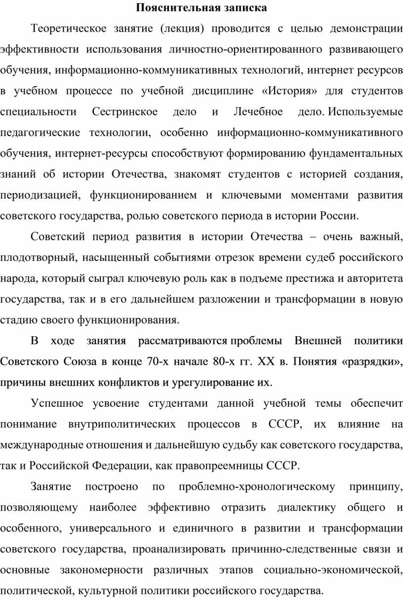Теоретическое занятие (лекция) проводится с целью демонстрации эффективности использования личностно-ориентированного развивающего обучения, информационно-коммуникативных технологий, интернет ресурсов в учебном процессе по учебной дисциплине «История» для студентов специальности Сестринское дело и Лечебное дело. Используемые педагогические технологии, особенно информационно-коммуникативного обучения, интернет-ресурсы способствуют формированию фундаментальных знаний об истории Отечества, знакомят студентов с историей создания, периодизацией, функционированием и ключевыми моментами развития советского государства, ролью советского периода в истории России.