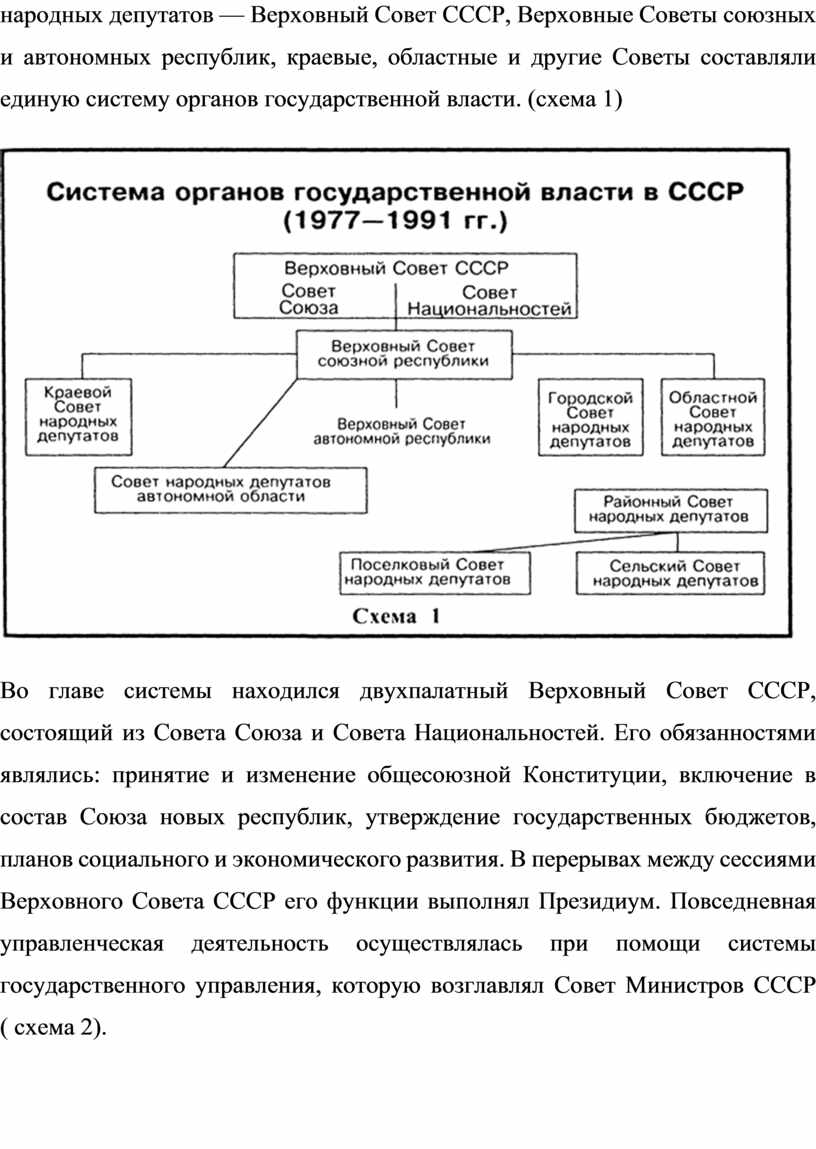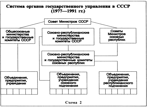 Во главе системы находился двухпалатный Верховный Совет СССР, состоящий из Совета Союза и Совета Национальностей. Его обязанностями являлись: принятие и изменение общесоюзной Конституции, включение в состав Союза новых республик, утверждение государственных бюджетов, планов социального и экономического развития. В перерывах между сессиями Верховного Совета СССР его функции выполнял Президиум. Повседневная управленческая деятельность осуществлялась при помощи системы государственного управления, которую возглавлял Совет Министров СССР ( схема 2).